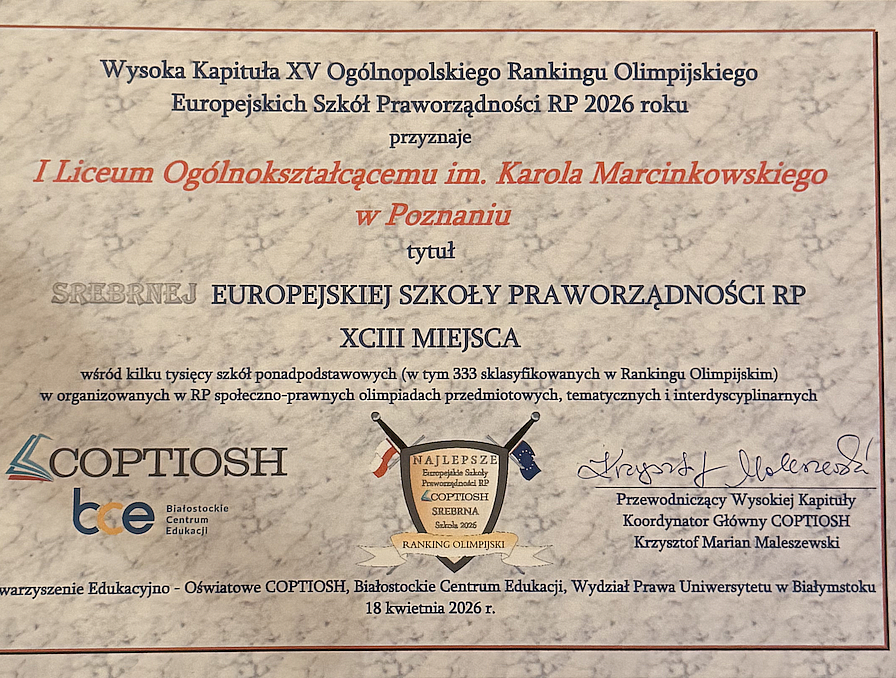 Jest to dla Piotra i dla nas podwójnie dobra informacja, ponieważ to siągnięcie zapewnia Piotrowi indeks na studia, w tym na prawo, a ponadto, dzięki sukcesom w Olimpiadach COPTIOSH nasza szkoła zaliczyła awans o 214 (!) miejsc w klasyfikacji Europejskiej Szkoły Praworządności (307->93) i uzyskała tytuł SREBRNEJ EUROPEJSKIEJ SZKOŁY PRAWORZĄDNOŚCI RP w organizowanych w RP społeczno-prawnych olimpiadach przedmiotowych, tematycznych oraz interdyscyplinarnych.